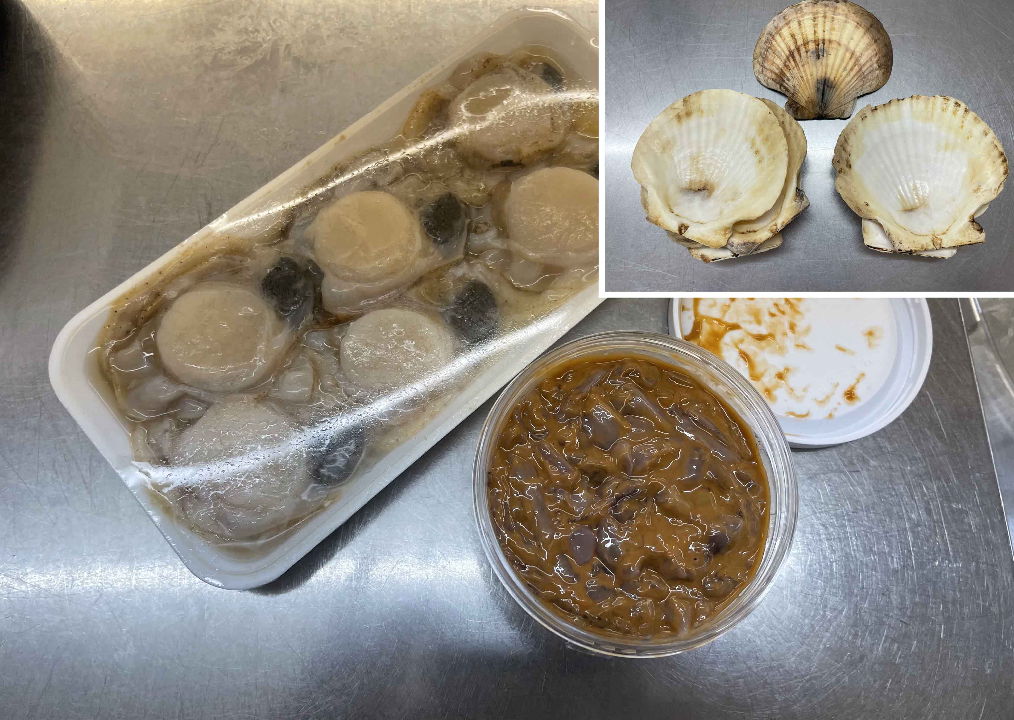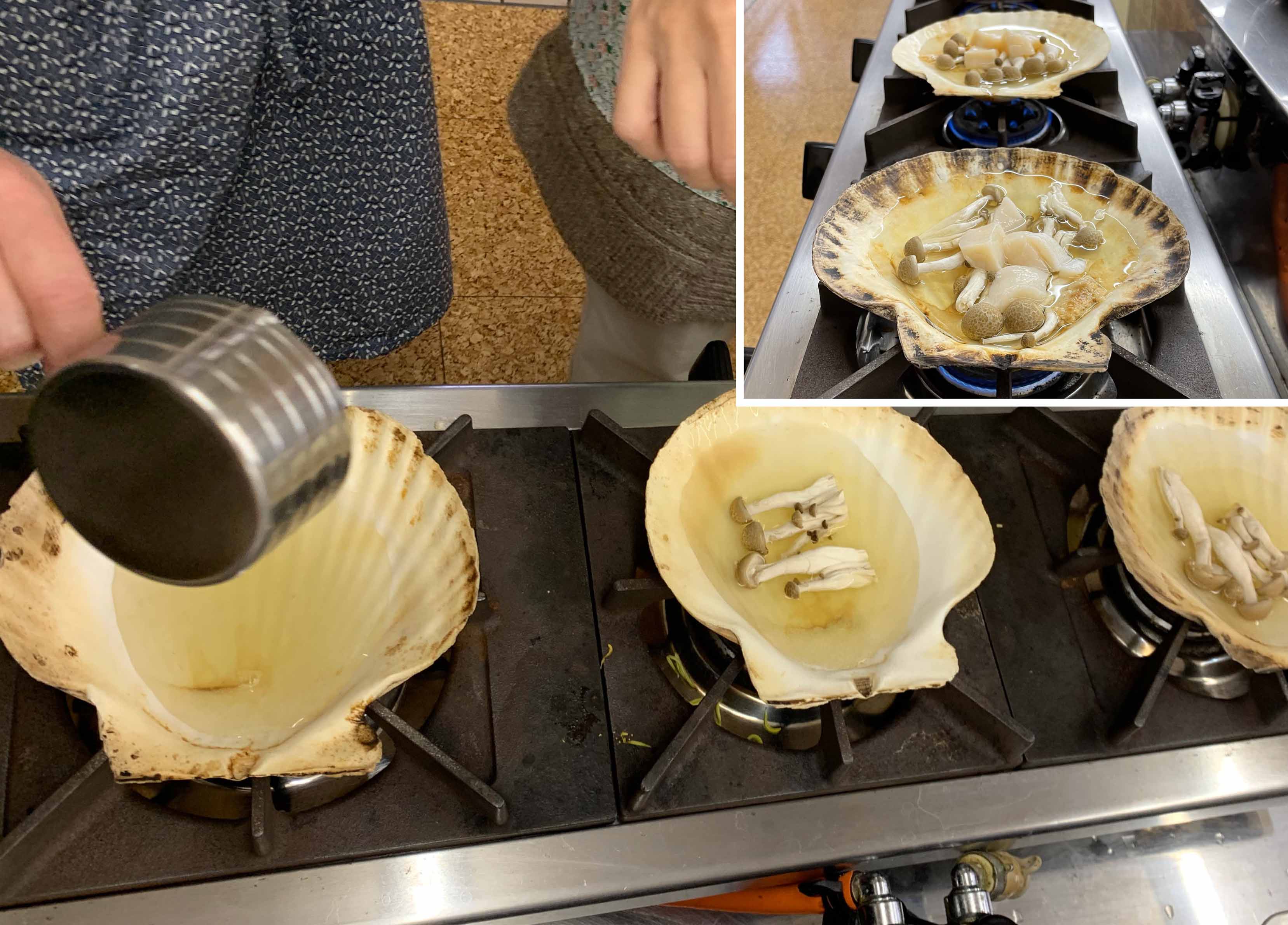 ①ホタテ貝に出汁を張り、シメジ、ネギ、ホタテを並べ火にかける。
