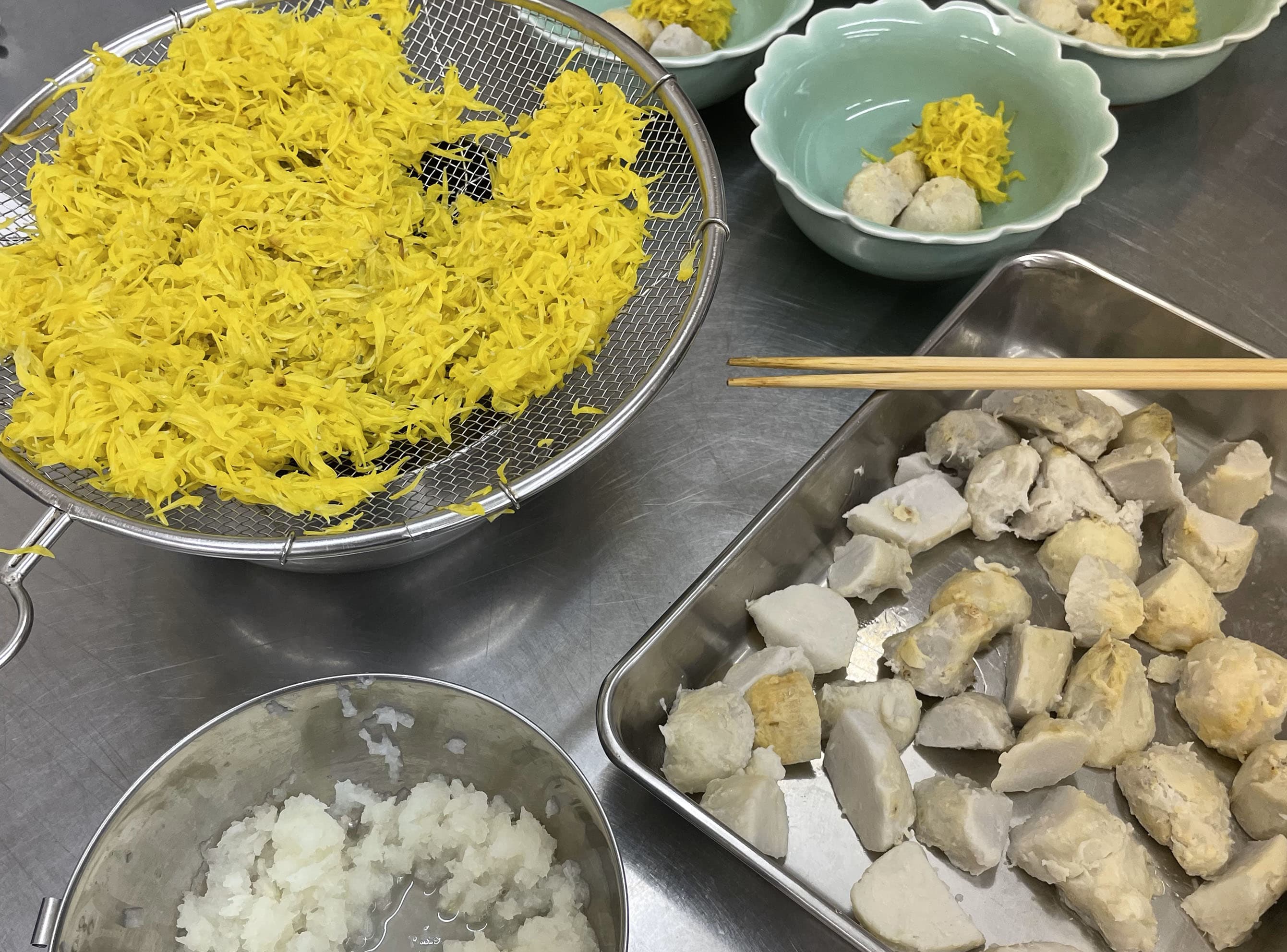 ④皿に里芋、茹でた菊、大根おろしを盛り付け、お醤油でいただく。