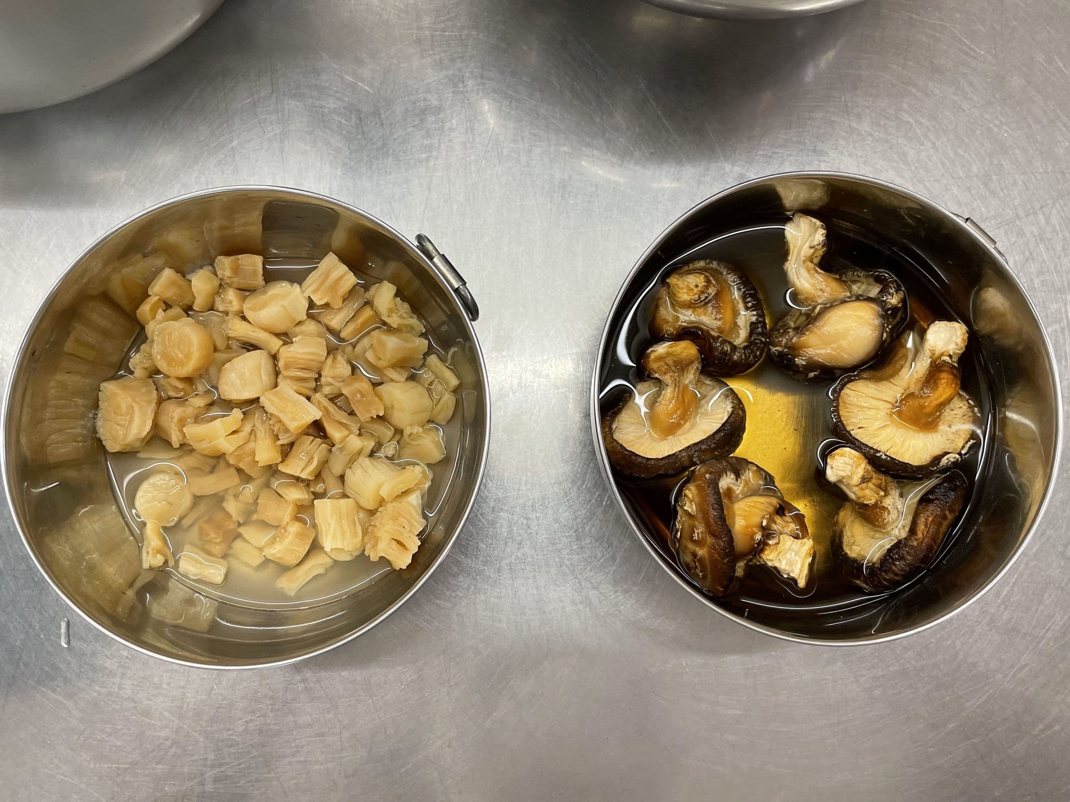 ①貝柱と干し椎茸は、1日水につけておく。