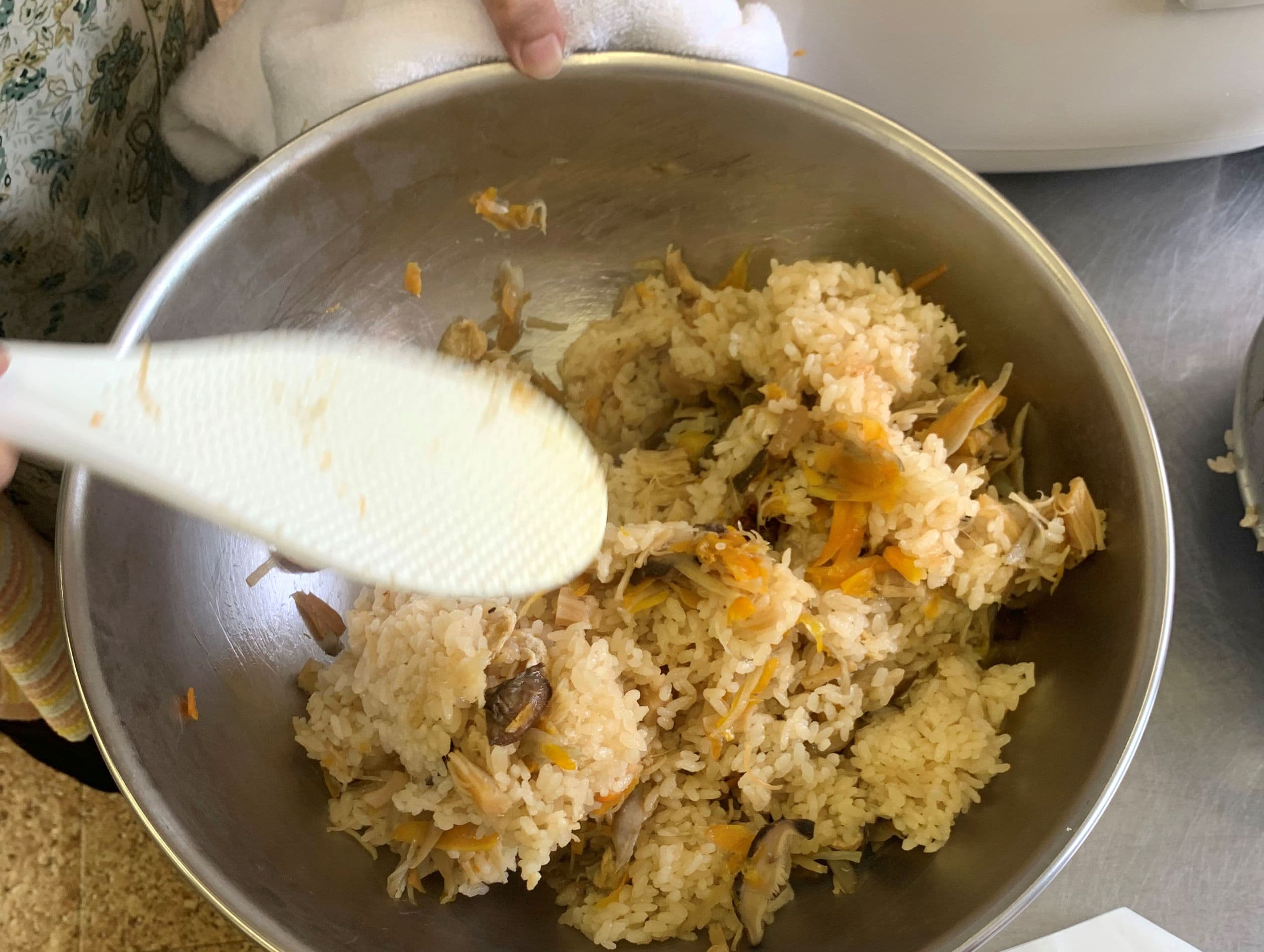 ④水から出した米・もち米に、③の汁とⒷをいれ、貝柱と干し椎茸のもどし汁(約3カップ)を炊飯目盛りより若干少なめに加え、③の具をのせて炊く。