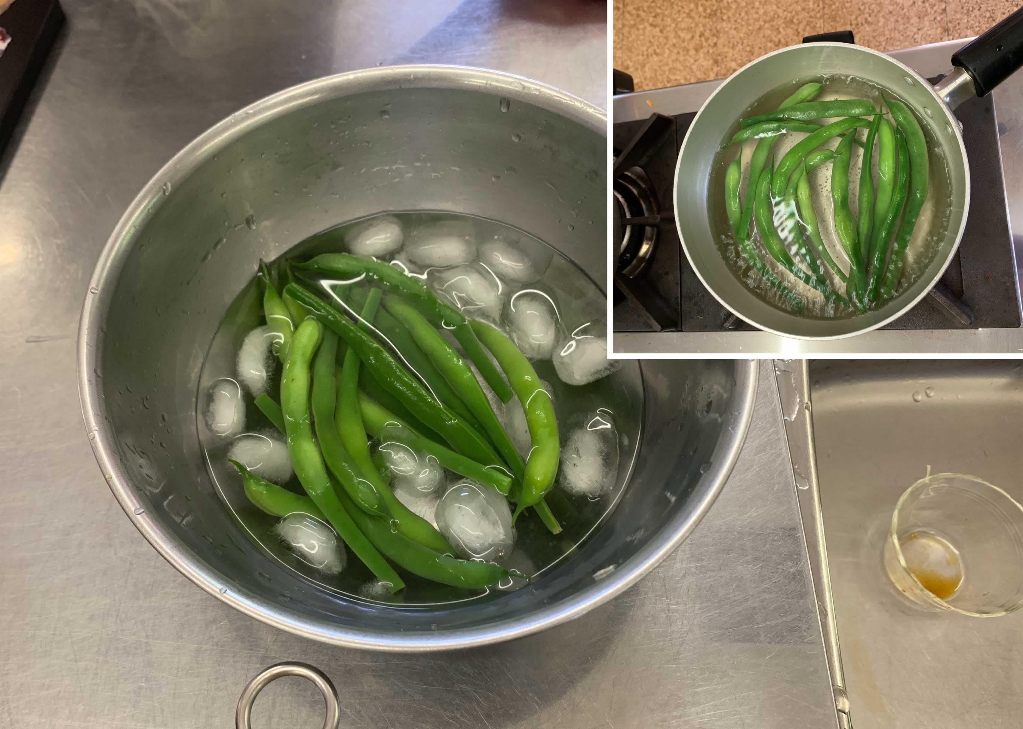 ⑤インゲン(又は絹さや)は、茹でて氷水にさらした後、細切りにする。