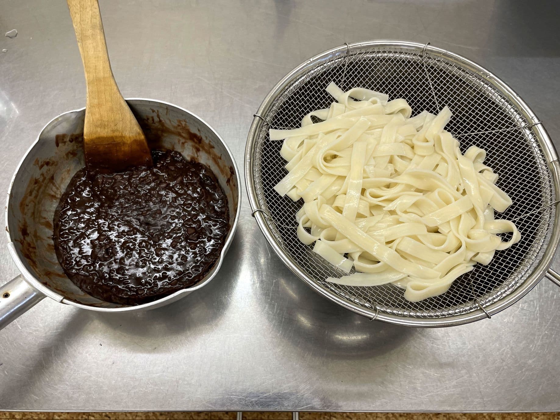 (あんは、その時使う分を、好みによって水を加え煮溶かし、濃度を加減する。)