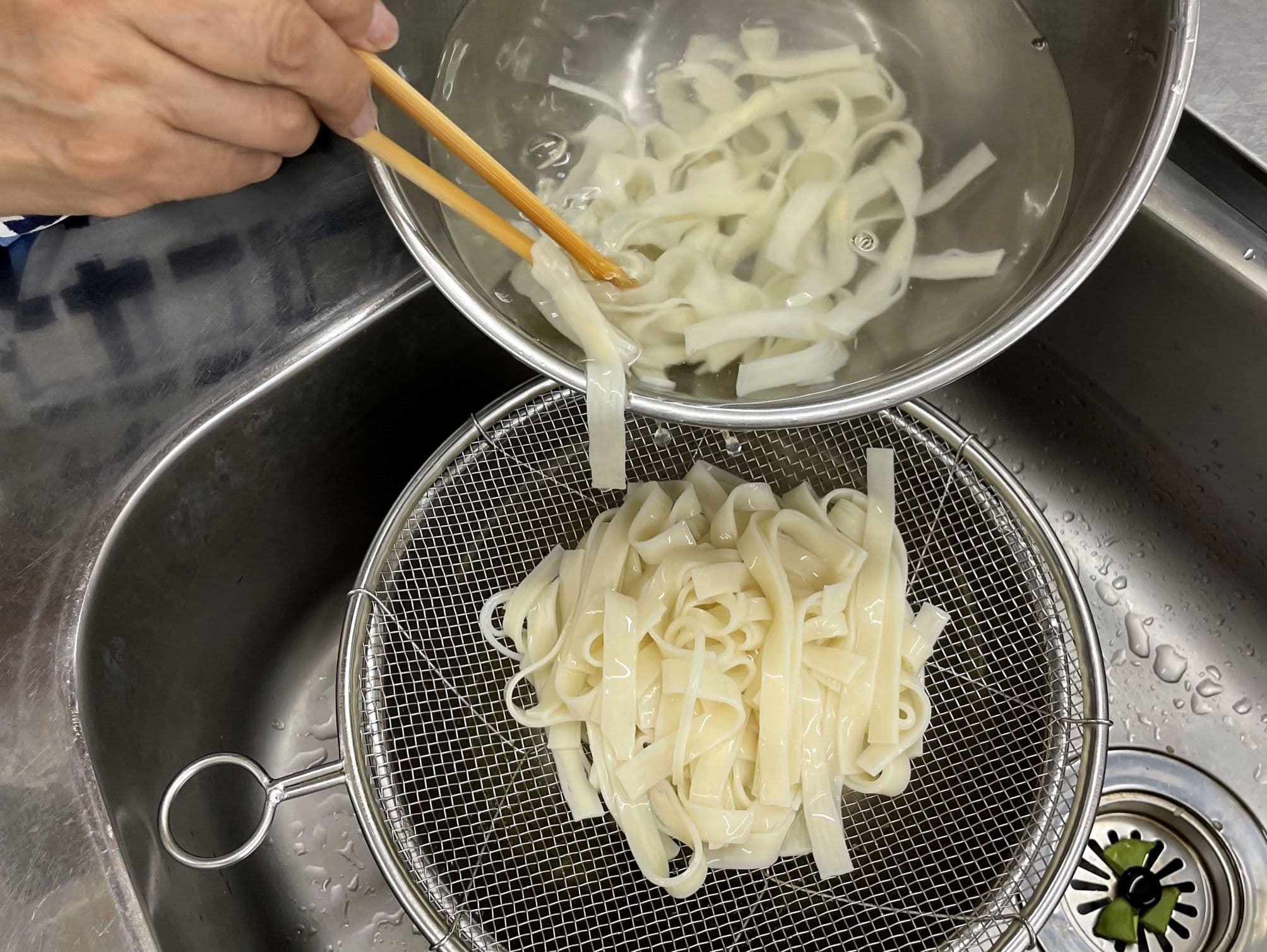 ①ひもかわは、半分に折り、たっぷりのお湯で茹で、洗ってぬめりをとる。