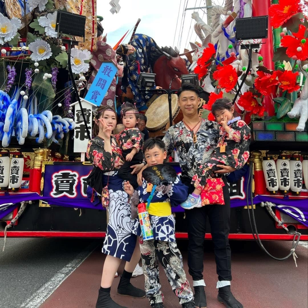 「山車作りの下絵をみながら何日も構想、実は設計図はないんです。作りながらサイズ感を考えます。歌舞伎にするか武者画にするか?練習しているお囃子・太鼓の側でじゃわめぎながら何度も打合せしながら進めて昨年は、山車審査で敢闘賞いただきました。昨年より今年、今年よりも来年と良い作品を作りたいの一心で頭の中は山車のことばかり。夢なのか現実なのかくらいに追い込まれるときもあります。山車の取付カラクリは、上にも横にも広がりますし、昼と夜のライトアップのどちらにも豪華絢爛に見えるよう試行錯誤してます。時には他の山車組との情報交換もします。神事なので神様に敬意を表してます。ライトアップ時はストロボを使うので電気屋・大工の職人さんと共同作業(裏方作業)もします。昨今は、猛暑対策でリヤカーに冷たい飲み物を準備し、最後までみんなで元気に山車小屋に戻ってくることが目標です。」と。オールマイティで何でもできる軍団!のイメージ。約300年江戸時代からの歴史と文化、継承される魂。これぞ八戸南部の夏祭りという心意気が伝わってきます。川口家も奥様・小学低学年の長男・6歳と4歳の娘と全員参加。家族の絆は最優秀賞ですね!