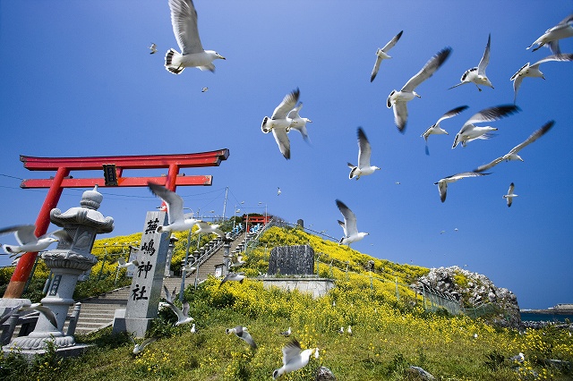 岸壁朝市を東に進むとウミネコの繁殖地蕪島に到着です。5月に産卵が始まり7月ヒナの誕生、時を過ごし親鳥の大きさになり巣立の練習を繰り返し8月に蕪島を飛び立っていきます。蕪島は「みちのく潮風トレイル」起終点で2019年6月9日、福島県相馬市まで全線開通となりました。
