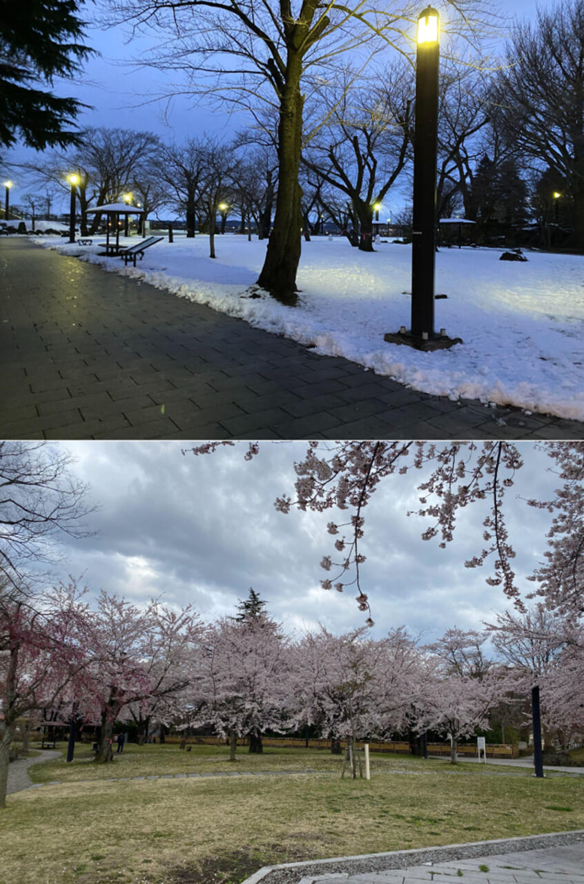 Il punto panoramico del parco è l’unico che io conosca della città, e considero la vista di Hachinohe fantastica, nonostante sia una semplice città. La bellezza del parco persiste in ogni stagione: con lo sbocciare dei fiori di ciliegio, con il verde e il caldo dell’estate, con i colori caldi dell’autunno e con la neve.